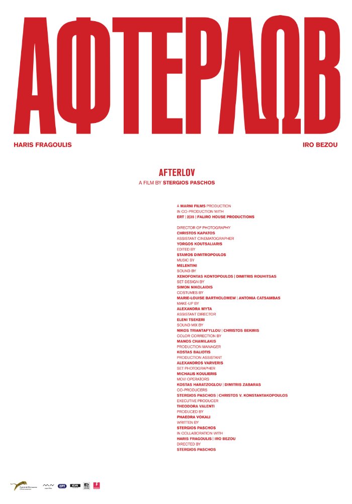 It's summertime in Athens and Nikos, a 30-year-old broke musician, is taking care of a luxurious villa in the suburbs that belongs to a friend of his. Between poolside cocktails and fooling around with the dog that he is meant to take care of, Nikos has a plan. Still unable to get over his recent break-up with Sofia, he figures this is a unique opportunity to get some much-needed answers and he invites her over for the weekend. Sofia delightfully accepts not knowing, of course, that Nikos' plans are not as innocent as they seem. Nikos locks himself up in the house with Sofia and refuses to let her leave until she provides some rationale for the break-up, turning their alleged carefree holiday into a mess of games, fights, laughs and introspection. Is Nikos ever going to get the answers he was looking for? Is Sofia ever going to be able to explain why they broke up? Afterlov is a funny, poignant and scathing post-love story between two people who refuse to grow up.